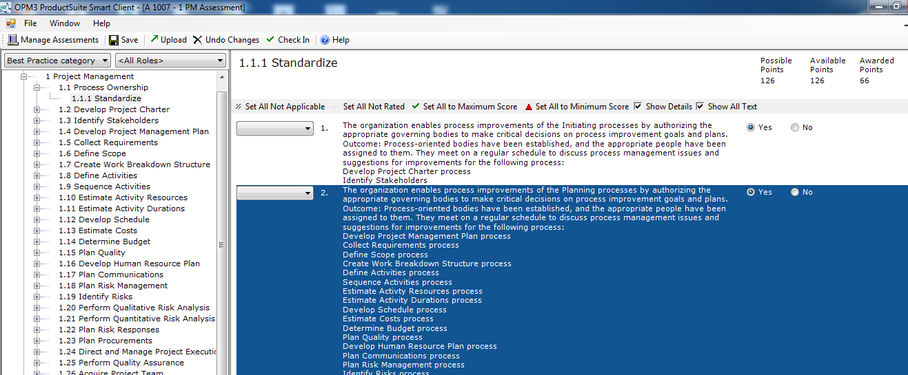 پس از وارد شدن به برنامه (شناسه کاربری و رمز عبور در دست مشاور و ارزیاب رسمی PMI می باشد ) ،2 بخش اصلی و 2 بخش فرعی وجود دارد .کاربر جهت تغییرات مشخصات کاربری خود می تواند منو User profile  را انتخاب نماید .منو دیگر مربوط به مشخصات سازمانها جهت ارزیابی می باشد .این مشخصات شامل :نام سازمان ، صنعت سازمان ،گردش مالی، تعریف دپارتمانها و مشخص نمودن دامنه ارزیابی ،مشخص نمودن نوع ارزیابی  و غیره می باشد .از منو های اصلی می توان به ابزار ارزیابی (Assessment  Tool) اشاره نمود .