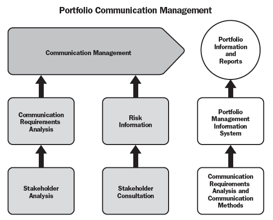 تصویر ذیل نمای کلی از مدیریت اربتاطات را نشان می دهد که شامل ذی نفعان، آنالیز نیازمندیهای ارتباطی،تمرکز مشاوره و مشارکت ذی نفعان برای شناسایی ریسکها و جریان ورودی مدیریت ارتباطات جهت اطلاعات و گزارش گیری پورتفولیو می باشد.ارتباطات پورتفولیو باعث تسهیل دو راه گوتگو موثر بین ذی نفعان داخلی، خارجی، اشخاص یا گروهها می شود که شامل :