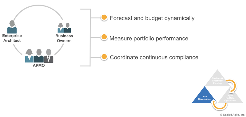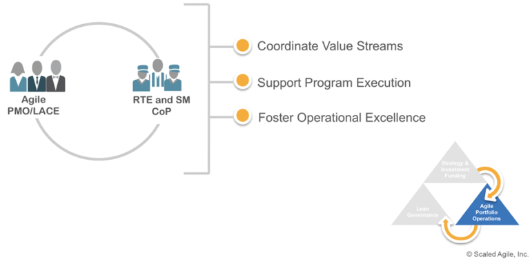 مدیریت از طریق APMO ، تابع LPM،میتواند به پیشرفت و کاربرد موفقیت آمیز الگوهای اجرایی در سر تا سر پورتفولیو، کمک کند.APMO،همچنین، معیارهای عینی را ارائه میدهد و به طرف چابکی کسب و کار پیش میرود.همچنین پشتیبان کننده COPs، برای مهندسین قطار راهکار و اسکرام مسترز است.این COPs،نقش محور،بازاری را برای اشتراک روشهای اجرایی برنامه اجایل موثر و دیگر دانشهای سازمانی،ارائه میدهد.